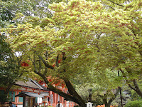 新緑の紅葉と赤い紅葉の芽とが、朱塗りの神殿と非常によくマッチする。